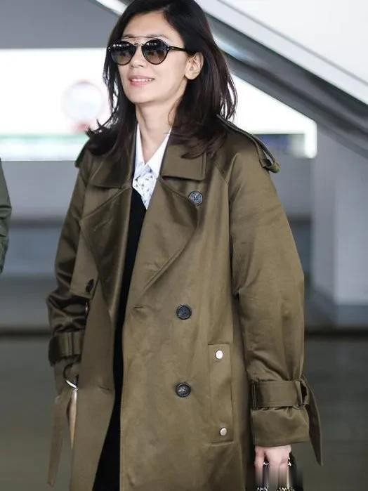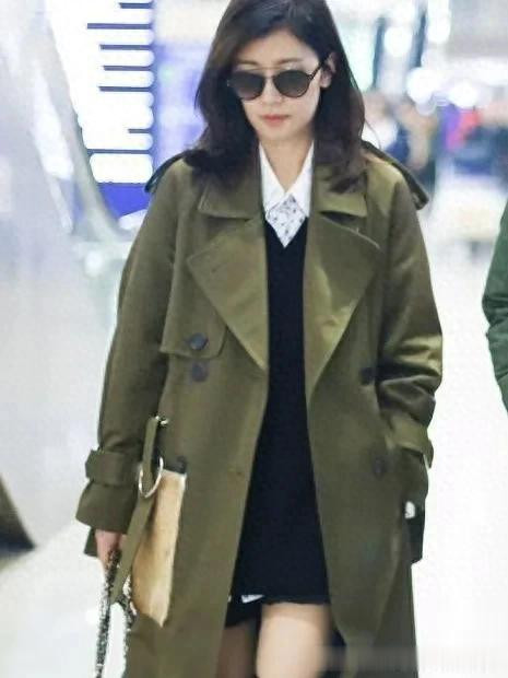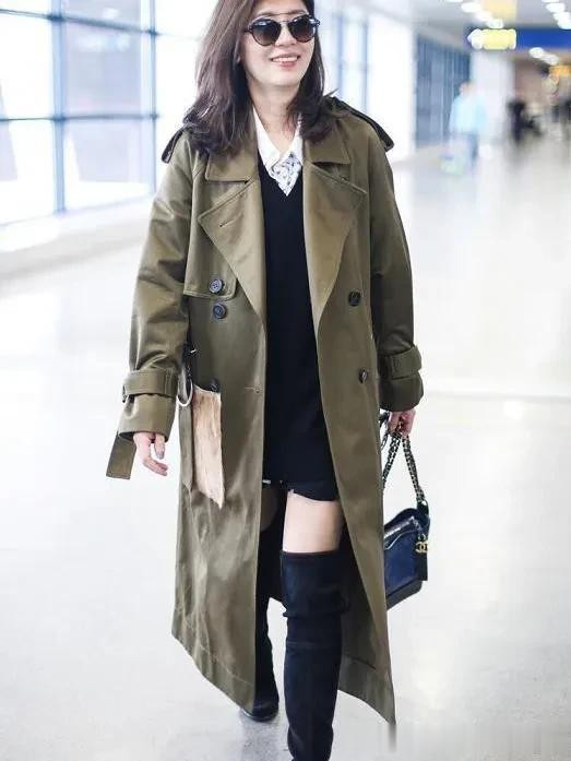 > 贾静雯机场私服真时髦! 军绿色大衣+小黑裙+长筒靴, 高级又洋气!